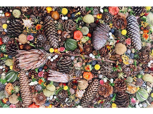 ドライフラワー〈nfmh.〉のPOP-UP STOREがオープンします。”jampacked”は「ぎゅうぎゅう詰め」。ドライフラワーやいろいろな木の実、フルーツ、スパイスなどをたくさん使った作品が並びます。