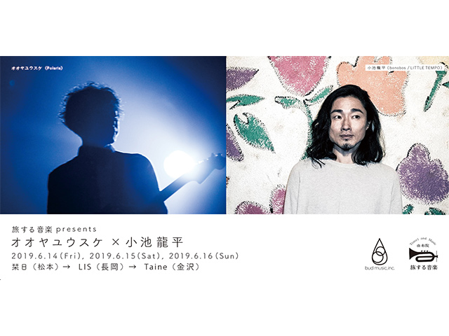 〈Polaris〉のフロントマン、オオヤユウスケと〈bonobos〉〈LITTLE TEMPO〉でも活躍する小池龍平。『STEREO』(オオヤユウスケ)『Butterfly』(小池龍平)と、共にソロアルバムをリリースしたふたりが、初のツーマンツアーを開催。松本、長岡、金沢の三会場を巡ります。[ 旅する音楽 presents ]