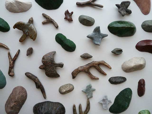 テーブルの上にランダムに置かれた小さな作品に触れて、