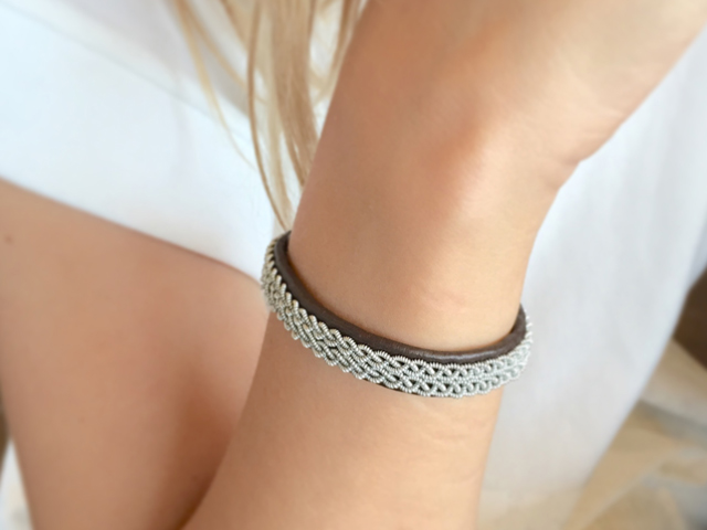 トナカイ革にピューター製の糸状ワイヤーを編み込むという、独創的なブレスレット。