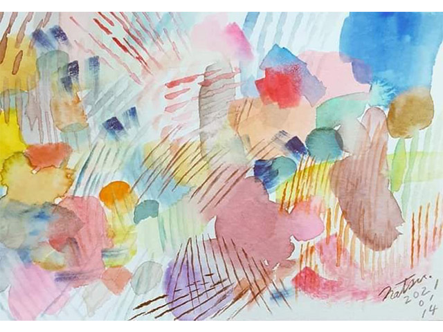 「いま」の切実な想いを素直に記した夏美さんの言葉に惹き込まれると共に、僕が動けなくなったもうひとつの理由は、これまで「猫」や「鳥」などの愛らしいモチーフが象徴的だった彼女の絵から、一切の具象が姿を隠し、抽象だけで描かれる日が増えていったことでした。そして、僕は、その変化を直観で「好きだ」と感じました。彼女のもうひとつの自然体を、知ったような気がしました。その素の表現を、まだ知らない誰かに伝えたい、届けたい、と思いました。