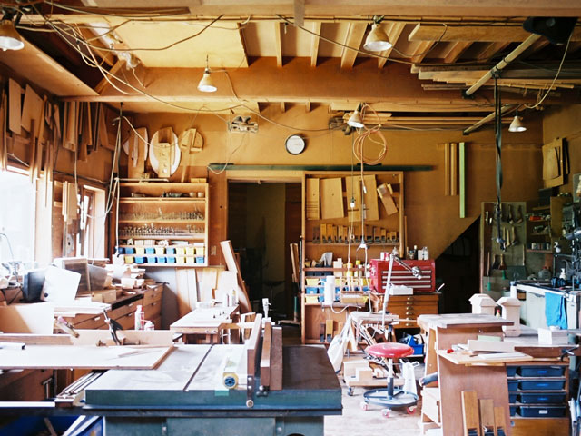 〈前田木藝工房〉は、明治三十四年、初代・前田南齋が東京・京橋で工房を開いたことに端を発する、江戸指物の家系。銀座や日本橋からやってくる芸者や歌舞伎役者のリクエストに応え続ける仕事には、当然ながら彼らと同じセンスが求められた。こうして培われた江戸の感覚は前田家の精神性として、代々受け継がれていく。時代が変わり、戦後日本が高度経済成長を遂げる中、大都市が消費だけの場に変わり果てたことを察した前田家は、二代目・保三のとき、生産と消費がバランスしている土地を求めて、湘南は鎌倉に移る。しかし、その移住先すらやがて宅地化が進み、電動工具の音などに配慮せざるを得なくなってしまう。父なきあと、さらなる新天地を求めた純一さんの足は自然と、奥さまの故郷である信州に向かっていた。松本の城下町気質が江戸のそれとよく似ている、と直感した純一さんは、その界隈を見てまわる中で、現在の地にたどり着く。木々に囲まれた三城の土地は、人工物からの影響を受けにくく、自らのセンスを希釈せずに済む。それは江戸の精神性という伝統を守り抜くために前田家の本能が下した判断だったかもしれない。