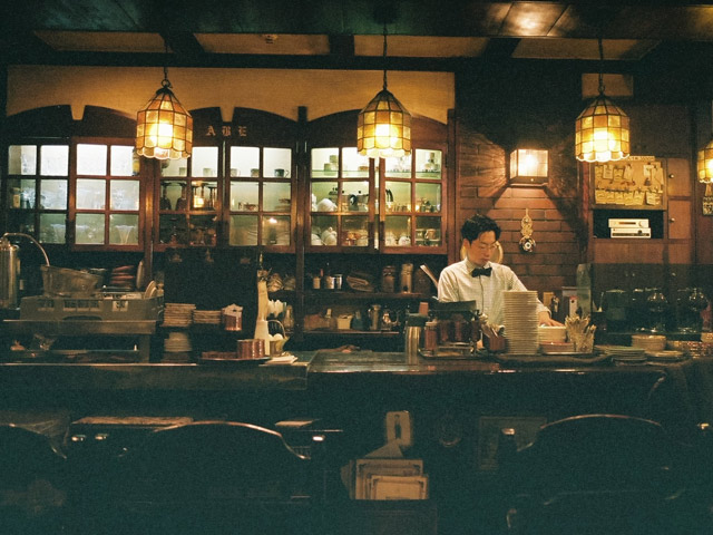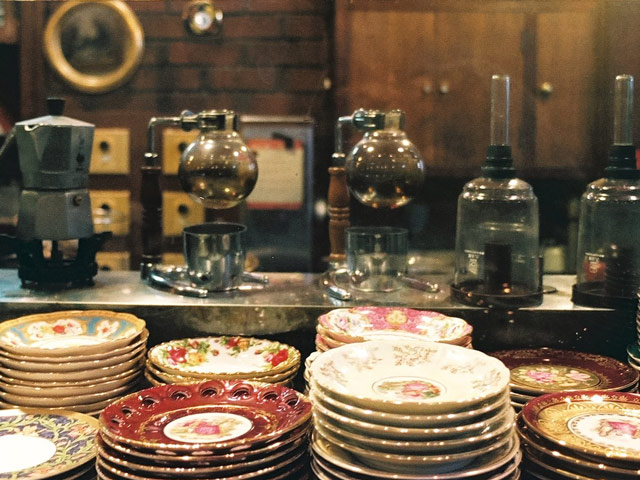 「空間の雰囲気がそこにいる人の気分をつくる」そう確信していた芳樹さんは、珈琲を美味しいと感じる空間をつくるべく、アートやアンティーク、植物の要素をひとつずつ取り入れて「アベワールド」を構築していった。例えば、カウンター正面の壁には、藤田嗣治の絵画『カフェ』が飾られているが、その中に描かれているグラスと同じグラスで供されるメニューがある。この徹底した創意工夫こそ「珈琲美学」を店名に冠する所以である。名物のモカパフェやカフェオレの演出も「美味しい」の手前に愉しさや驚きを置くことで、その美味しさが何倍にも膨れることを熟知している芳樹さんの美学に基づくアイデアだ。ユニークなモーニングの仕組みも然り。「まずは自分が楽しくないと」と、常に次のトライを続けてきた。