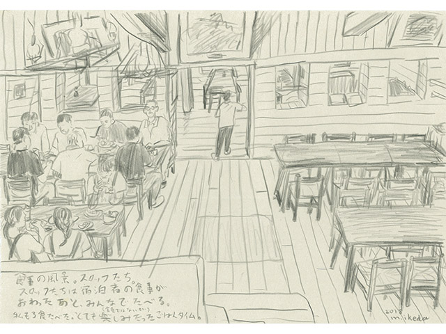 大阪在住の画家、マメイケダが昨年に引き続き、今年も再び〈涸沢ヒュッテ〉へ。会期前半はそのまま作家が松本に滞在し、ギャラリーにて滞在制作。山行で見た風景、松本の街や食べ物を描きます。六月に出版した絵本『おなかがへった』(WAVE出版)の原画の展示も。会期後半は〈涸沢ヒュッテ〉で描いた山行スケッチなどの新作を発表します。