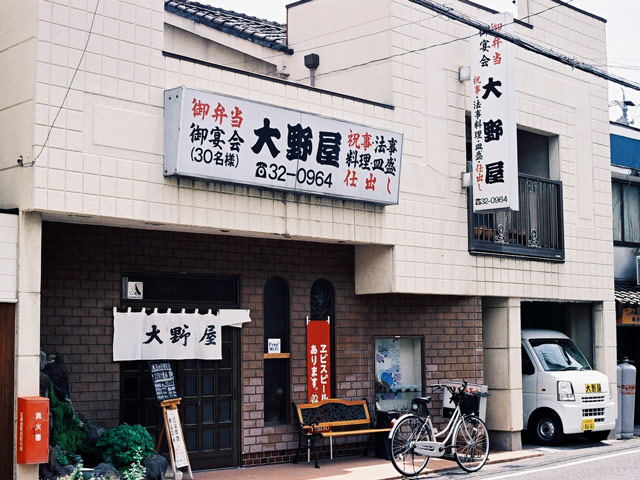 もともと松本の西方、上高地に至る手前の島々地区で生まれた祖父が、東京・神田は万世橋のたもとで始めた洋食屋がその興り。そして、大正十二年の関東大震災で被災、帰郷した一家は、松本市街地で和洋食店を再開した。現在の店舗がある場所ではなく、女鳥羽川沿い、中の橋のたもと、中町通り側の角地がリスタートの舞台。先程の写真には、このときの木造三階建ての店舗を背景に人々が集まっている。養蚕業が興盛を極めた時代の松本では、大野屋に外食に出かけることは市民の娯楽のひとつだった。店は宴会に次ぐ宴会で、大いに賑わったという。昭和二十年頃、道路拡張に伴い、当時の店舗が取り壊しを余儀なくされると、大橋通り沿いの現在の位置に移転。その数年後に養子入りした貴由さんのお父さんが「駅前ではないから(お客さんを)待っているだけではいけない」と、いまも続く仕出しの仕事に着手し、成功を収めた。