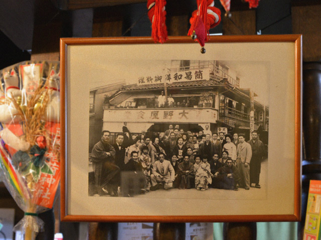 「昭和九年頃のもの」という親族の集合写真をレジ頭上の定位置から外して、店主の大野貴由さんが持ってきてくださった。「この女の子が僕の母。昭和二年生まれの母が、ほら、七歳くらいでしょ。だから昭和九年頃の写真かな」見ると、和装の可愛らしい少女が大勢の大人たちに囲まれて写っている。このお母さんが先代で、貴由さんが三代目。街の人たちに親しまれる食堂〈大野屋〉の歴史は長い。