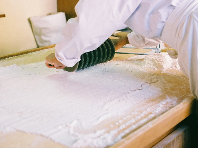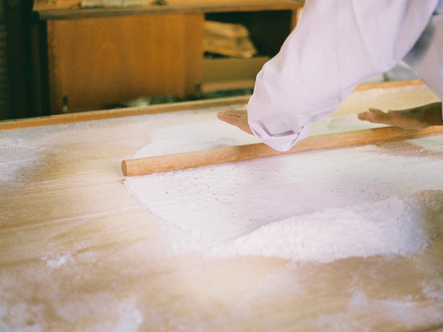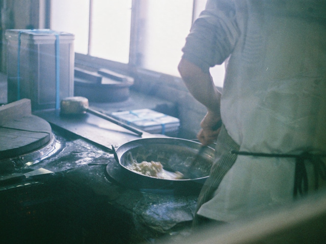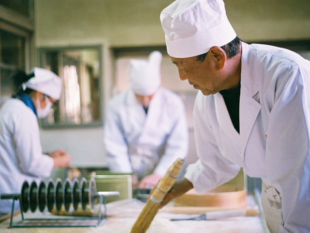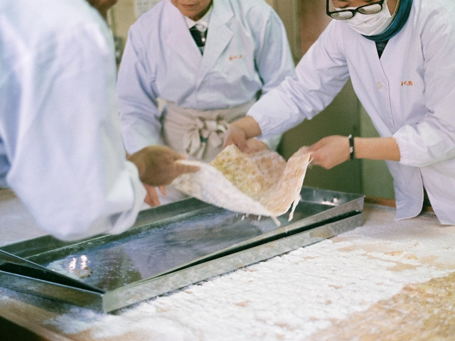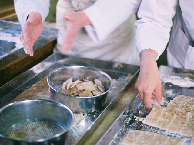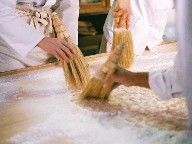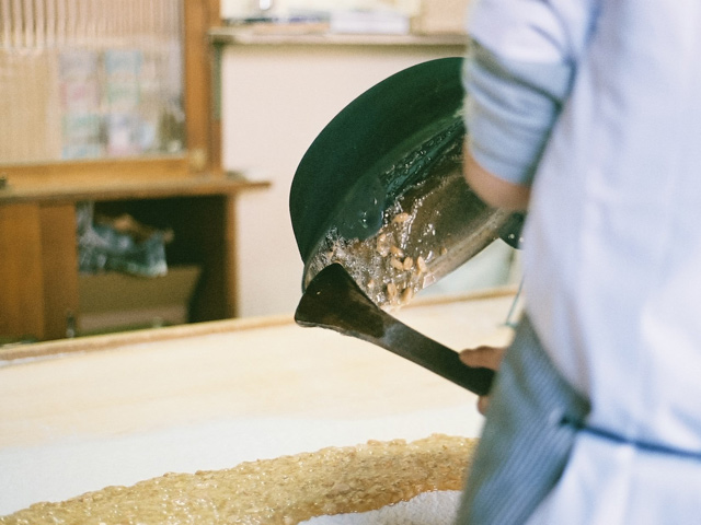 併設している直売店に入り、カウンター脇のドアから奥の製造所に進むと、三名の従業員の皆さんが飴づくりの最中だった。ガラス戸で仕切られた、さらにひとつ奥の部屋で、四代目・田中聡さんが、薪をくべる竃に向かい、飴を煮詰めている。季節や天候によって素材の状態が変わるから、適切な柔らかさの見極めは、田中さんの経験と感性がすべて。木べらに感じる飴の重さや、飴の糸の引き具合で、火から外す瞬間を決める。程よく溶けた飴は、鍋ごとこちらの部屋に運び込まれ、粉を敷いた作業台に流し出される。その飴をのし棒で平たくして、特製のローラーカッターで切り込みを入れ、手箒でまわりの粉を払う。バットに移し、手で割っていくと、あの「まめ板」が姿を現した。すべて手仕事。その一連の所作の美しさといったら。見惚れていると、ちょうど三人の作業が一巡したころ、田中さんがガラス戸を開けて、次の水飴を届けにきた。まさに阿吽の呼吸だ。