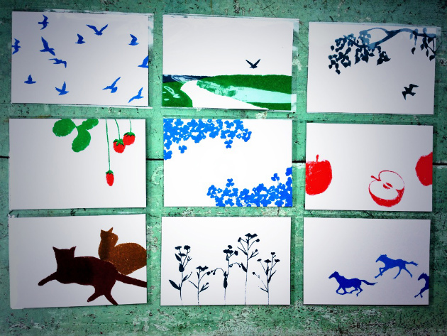 鳥や草木のモチーフが描かれた温もりのあるデザインと色づかい。 デジタル孔版印刷機を使った印刷方法によって、 1枚ずつ違う刷り味に仕上がっています。